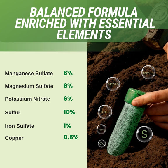 - COMPLETE PALM TREE FOOD: Lutz Palm Tree Maintenance Spikes offer a balanced tree fertilizer spike formula tailored for palms and ferns. With essential nutrients like manganese (6%), magnesium (6%), potassium (6%), sulfur (10%), iron 1%), and copper (0.5%), these plant food spikes combat common deficiencies and promote lush growth in your garden, making them an ideal choice for enriching your tree spikes fertilizer routine.